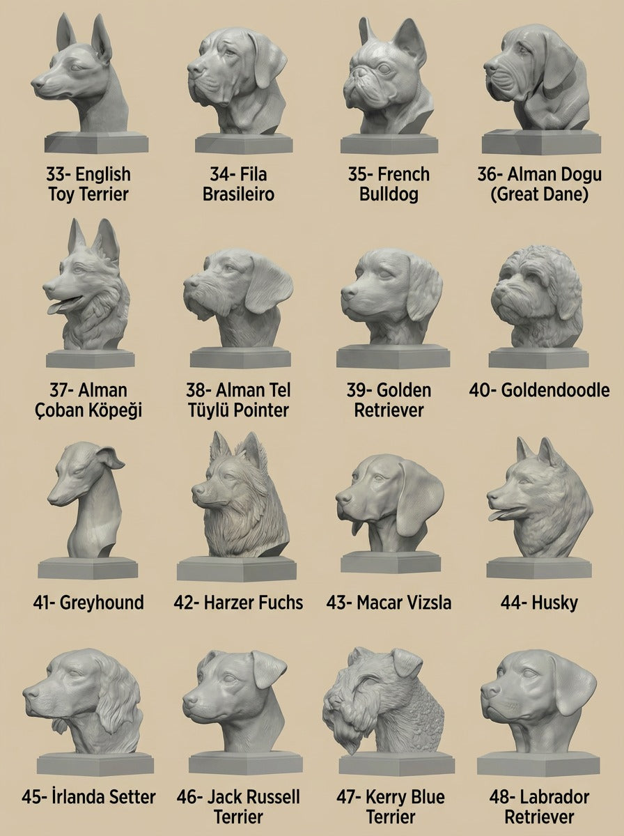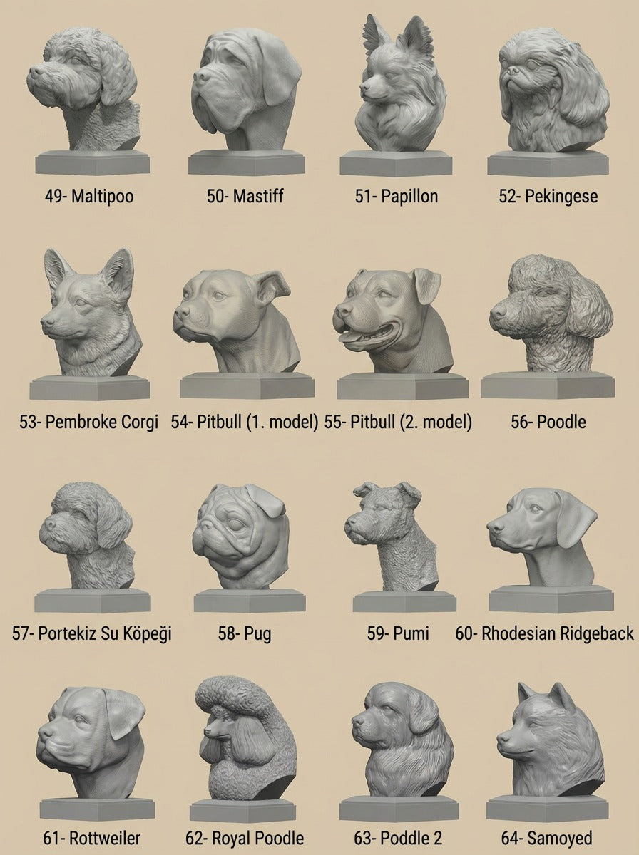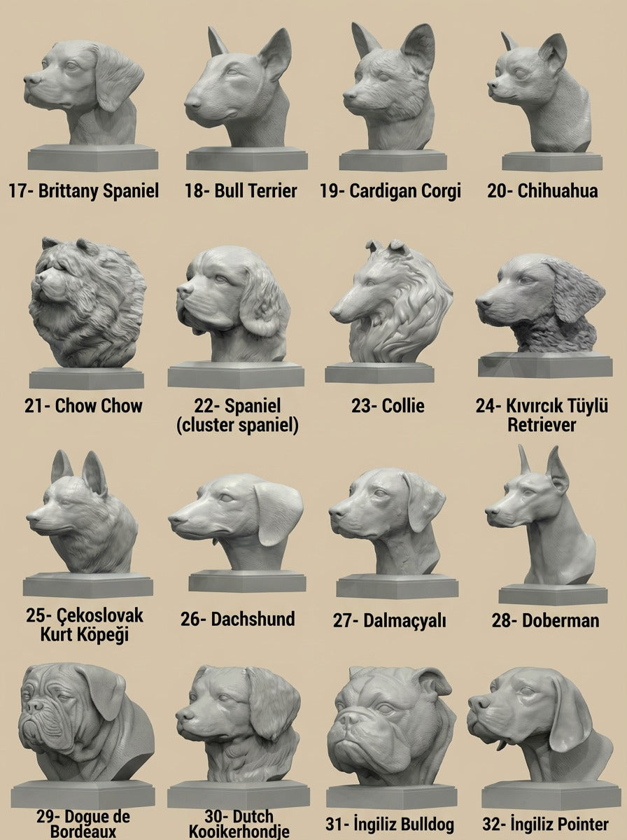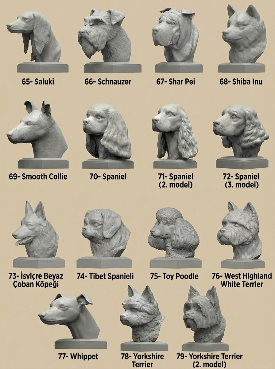 Gerçek köpek ırklarından ilham alınarak hazırlanmış yüksek detaylı 3D baskı büst koleksiyonu.